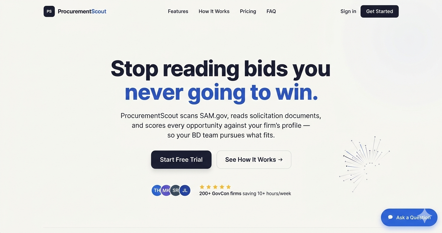 Saves government contracting teams hours of manual review by automatically scanning SAM.gov, reading solicitations, and scoring each opportunity on eligibility, compliance, and fit — so teams pursue only the contracts they can win and stop wasting resources on dead ends.